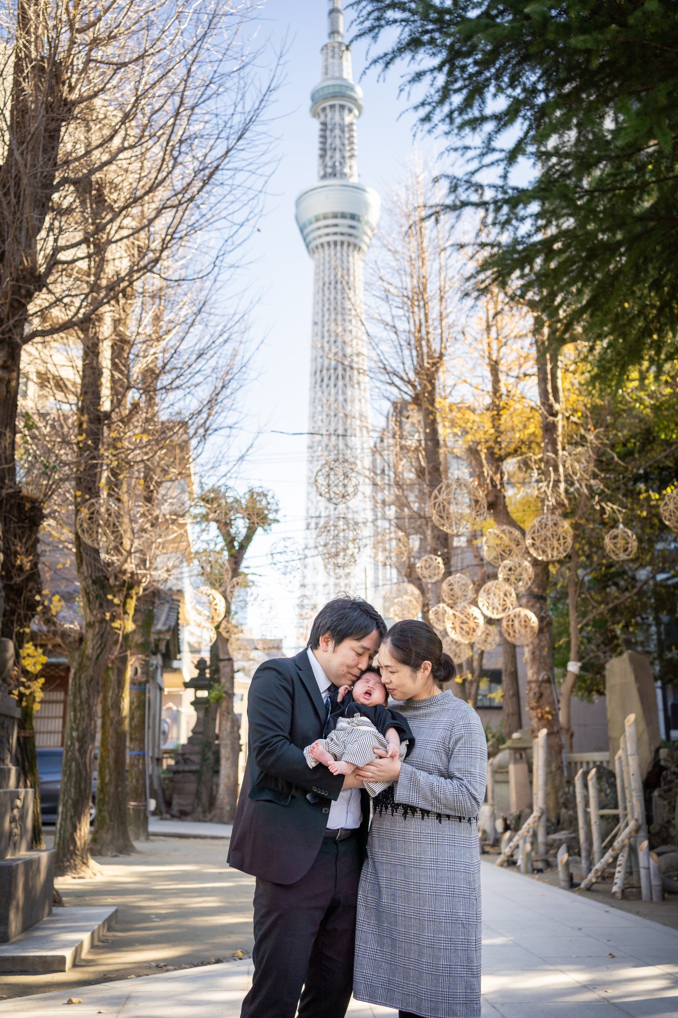 「隅田川を挟み、浅草の喧騒を対岸に望む牛嶋神社。コンパクトな境内へ一歩足を踏み入れると、そこには驚くほど静かで凛とした空気が満ちています。1000年を超える歴史と、空高くそびえるスカイツリー。伝統と未来が重なり合うこの場所は、お子さまの門出を祝うお宮参りにもぴったりです。当日は、お参りの一瞬一瞬を大切にシャッターを切っていきます。時には、少し趣を変えて隣接する隅田公園にも足を伸ばして撮影することも。「もし泣いちゃったらどうしよう…」と心配されるかもしれませんが、どうぞ安心してください。泣き顔も、眠っている顔も、すべてが「あの日」だけの宝物になります。ご家族のペースに合わせて進めていきますので、四季折々の彩りに包まれながら、リラックスして撮影を楽しみましょう!」