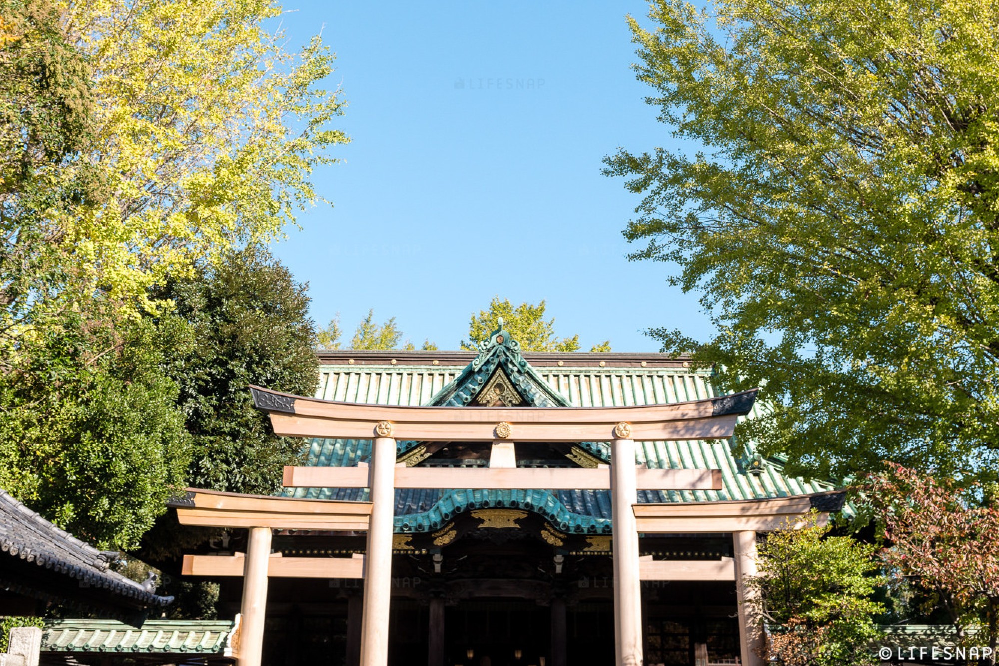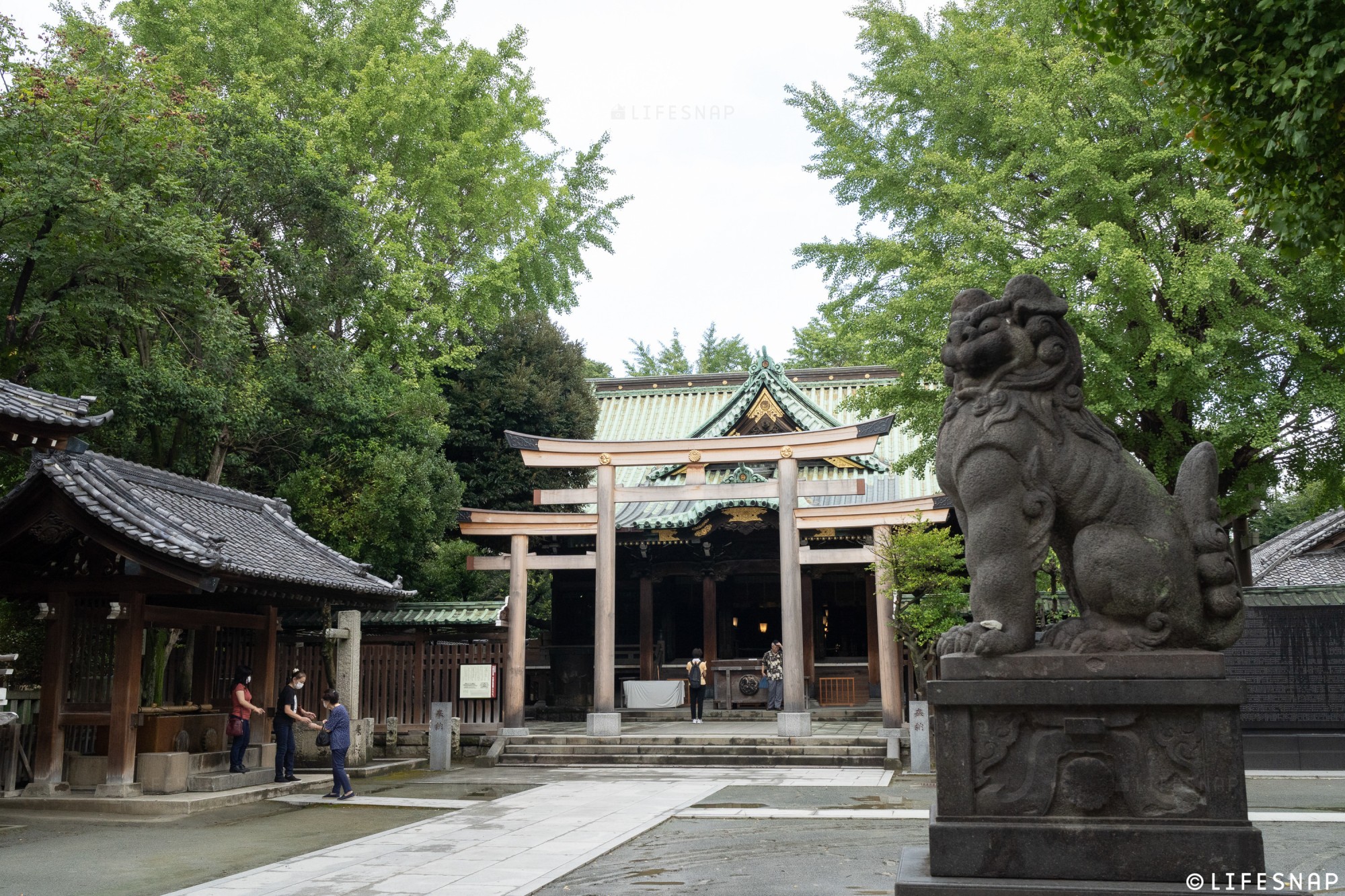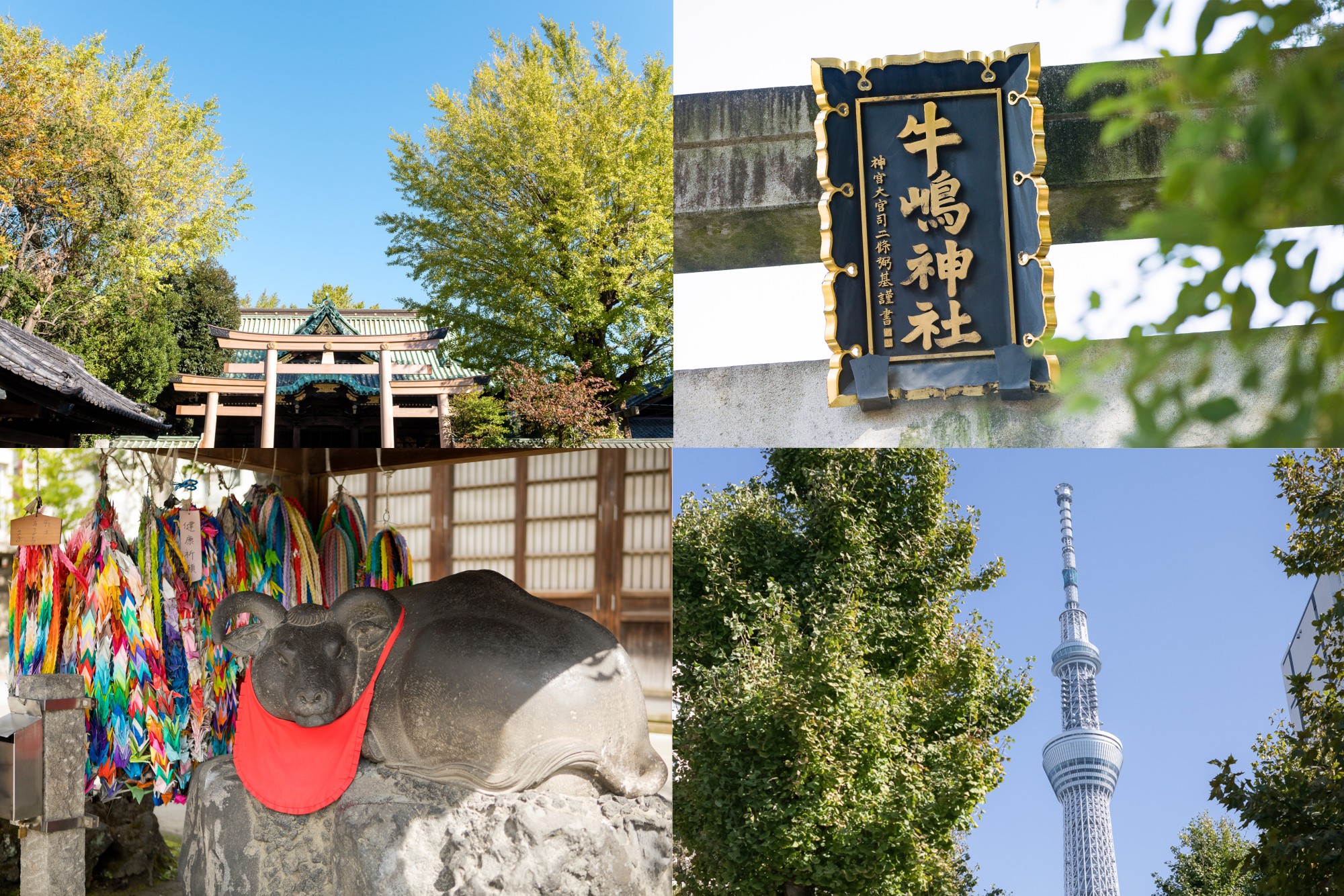 境内には全国的にも珍しい「三輪鳥居」や、体の悪いところと同じ場所を撫でると良くなるとされる「撫で牛」、さらには凛々しい「狛牛」など、見どころもたくさん。5年に一度、本物の牛が牛車を引いて街を練り歩く伝統のお祭り「神幸祭」でも知られています。都心にありながら緑豊かで落ち着いた雰囲気があり、春の桜や秋の銀杏など、四季折々の美しい彩りが記念写真をより華やかに引き立ててくれます。