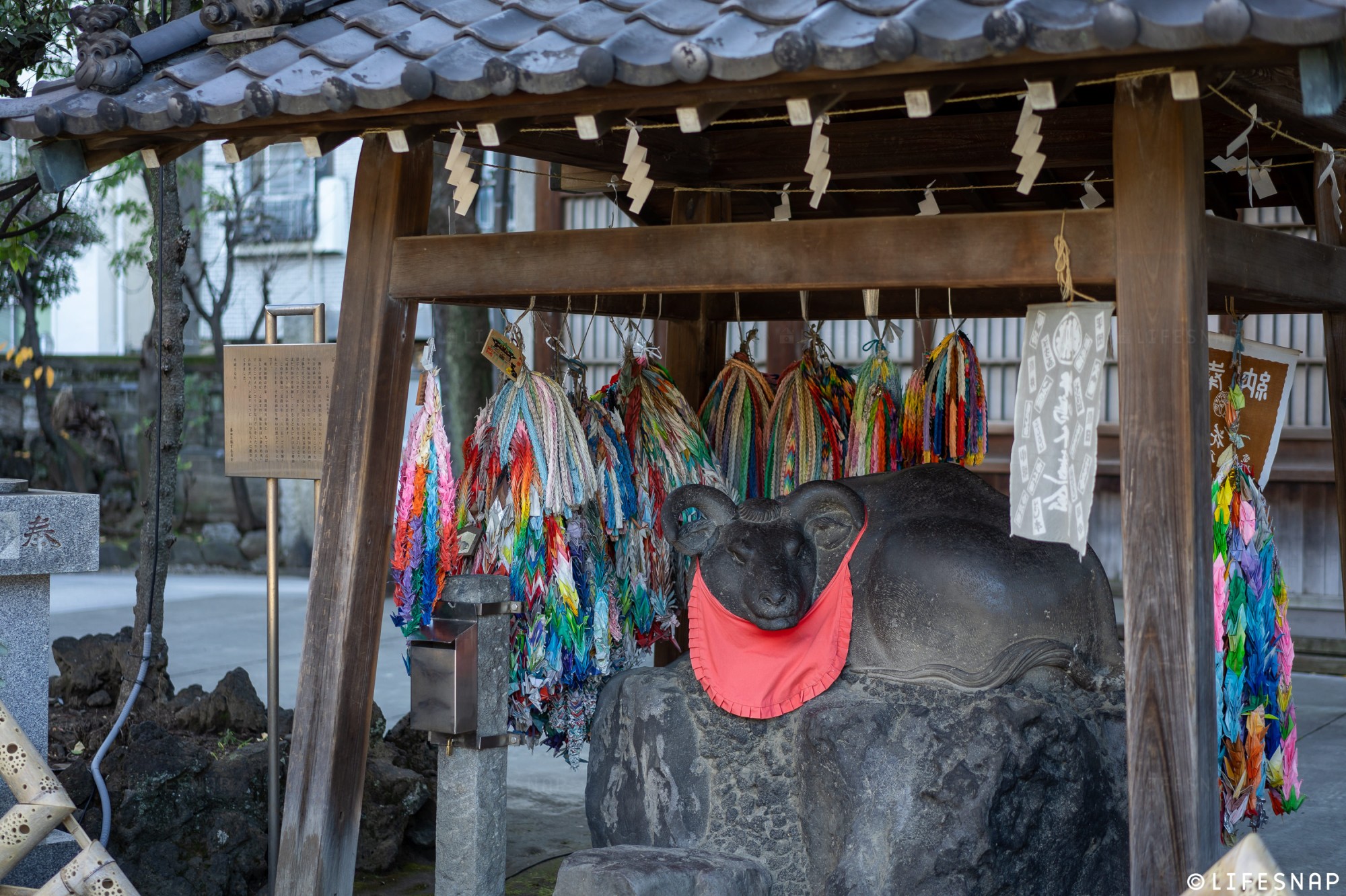 参道の右手にある撫で牛は墨田区の登録有形文化財です。200年ほど前に奉納され、江戸時代から庶民に親しまれてきました。自分の体の悪いところと同じ所を撫でると病が治ると言い伝えられています。