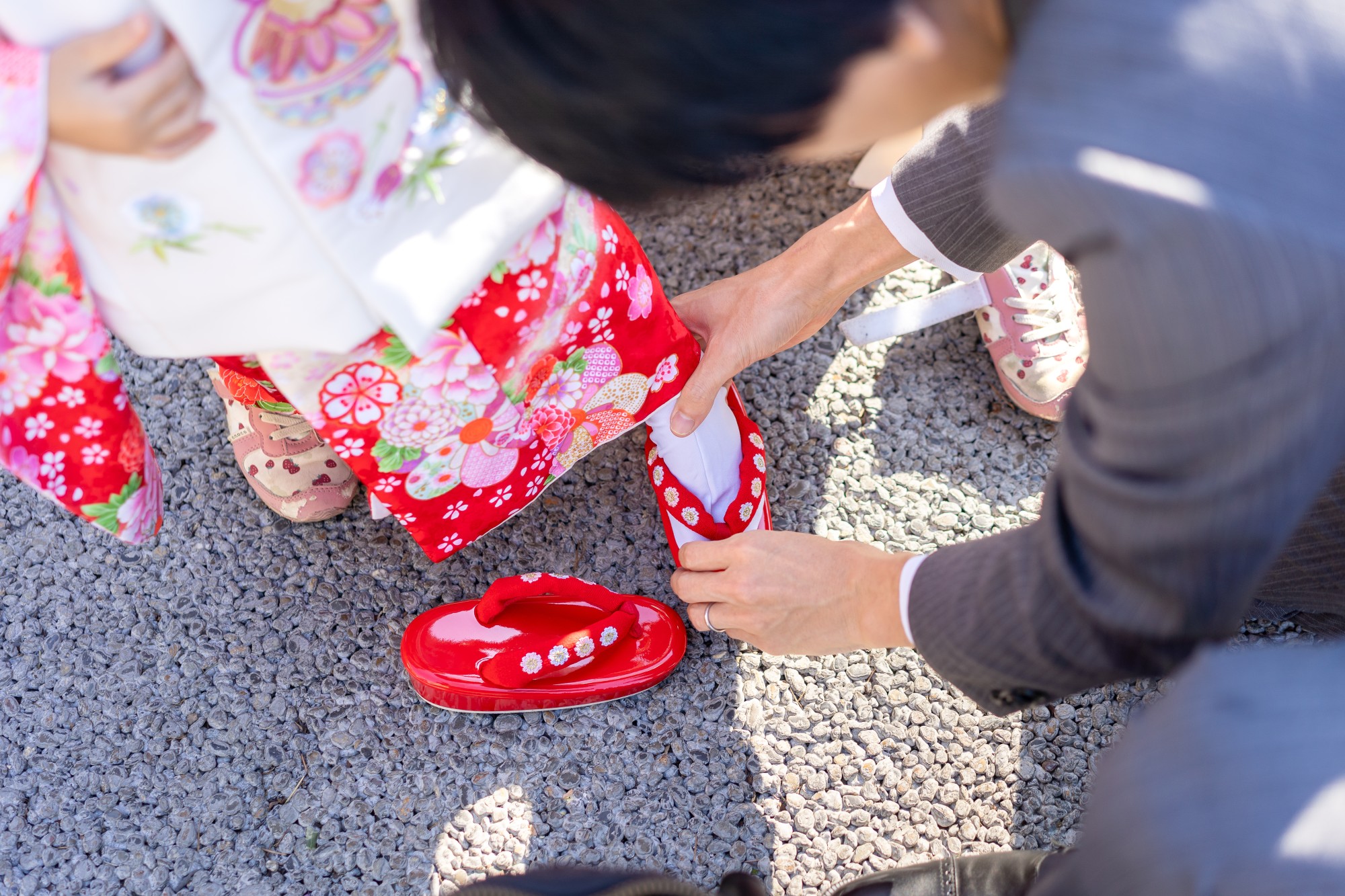 足袋や草履などの和装用の履物は、お子さまにとって歩きにくいと感じることも多いので、お手元にあれば実際に履いて練習してみてくださいね。