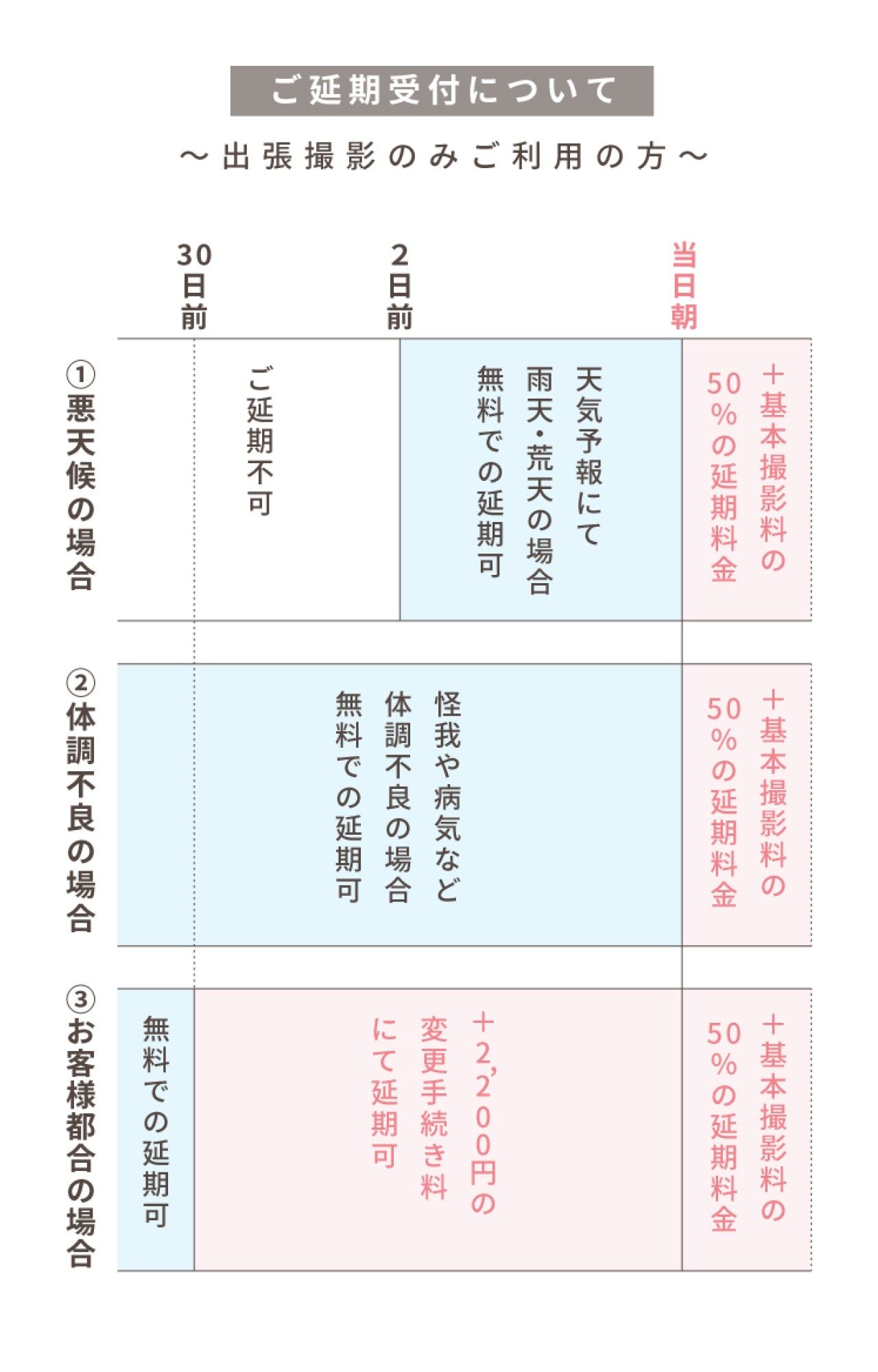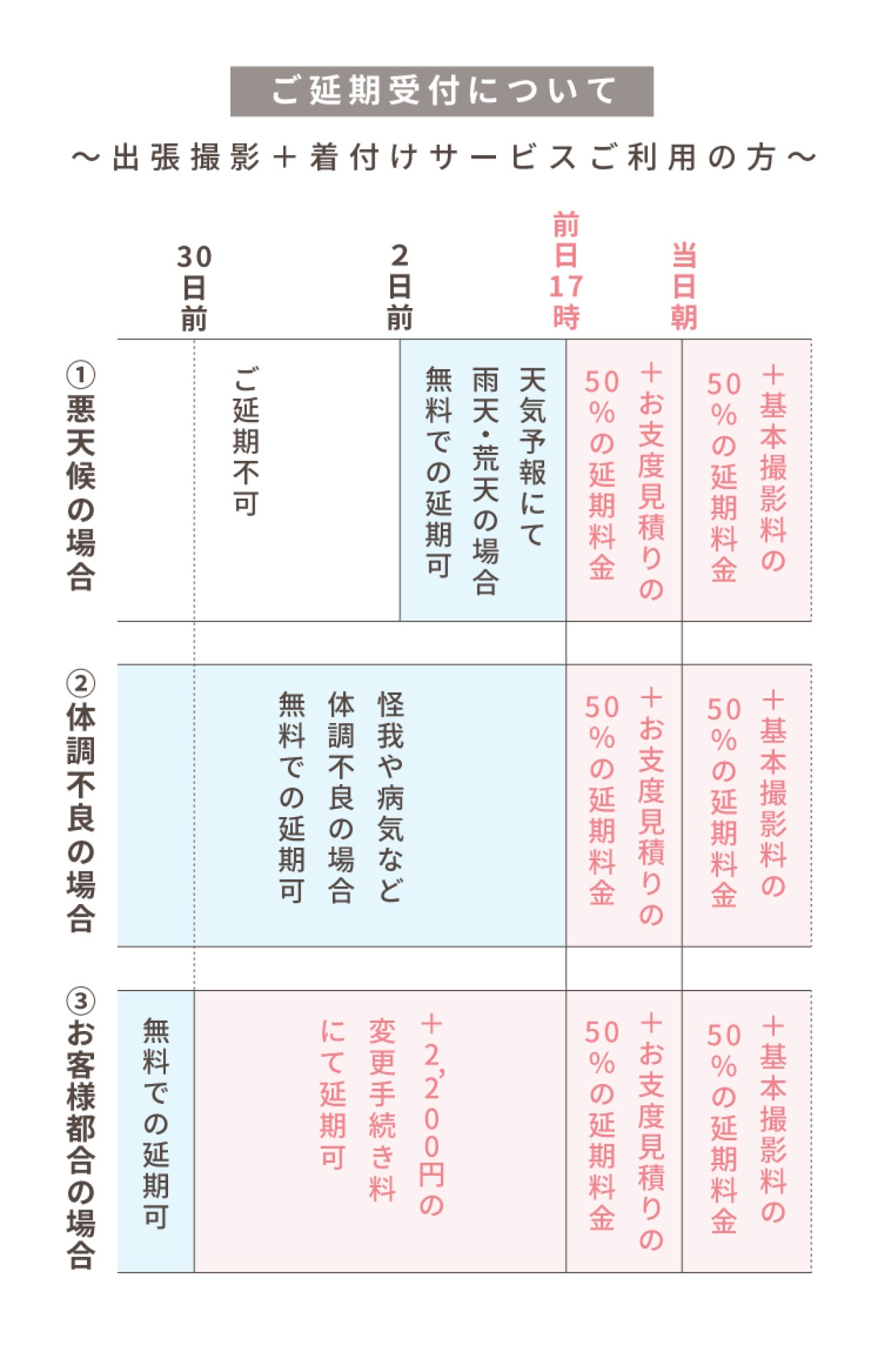 ・延期によって撮影日が通常期から繁忙期、または繁忙期から通常期への変更となる場合は、該当日程の料金にあわせて差額を調整いたします。