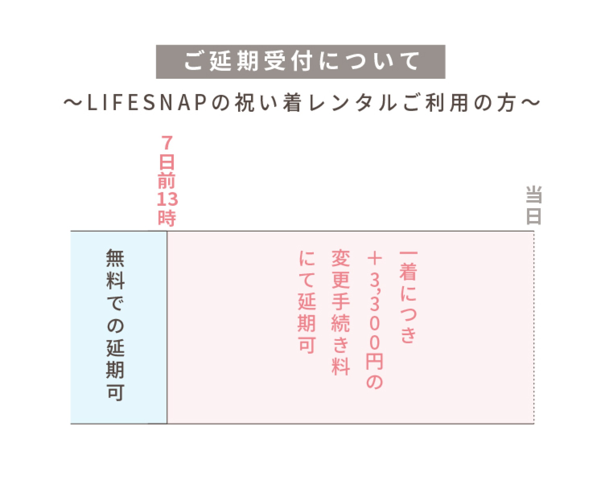 7日前を過ぎてからの延期のお申し出は、貸出しの手配〜発送準備に入っておりますため、1着毎に3,300円(税込)の変更手続き料を頂戴いたします。