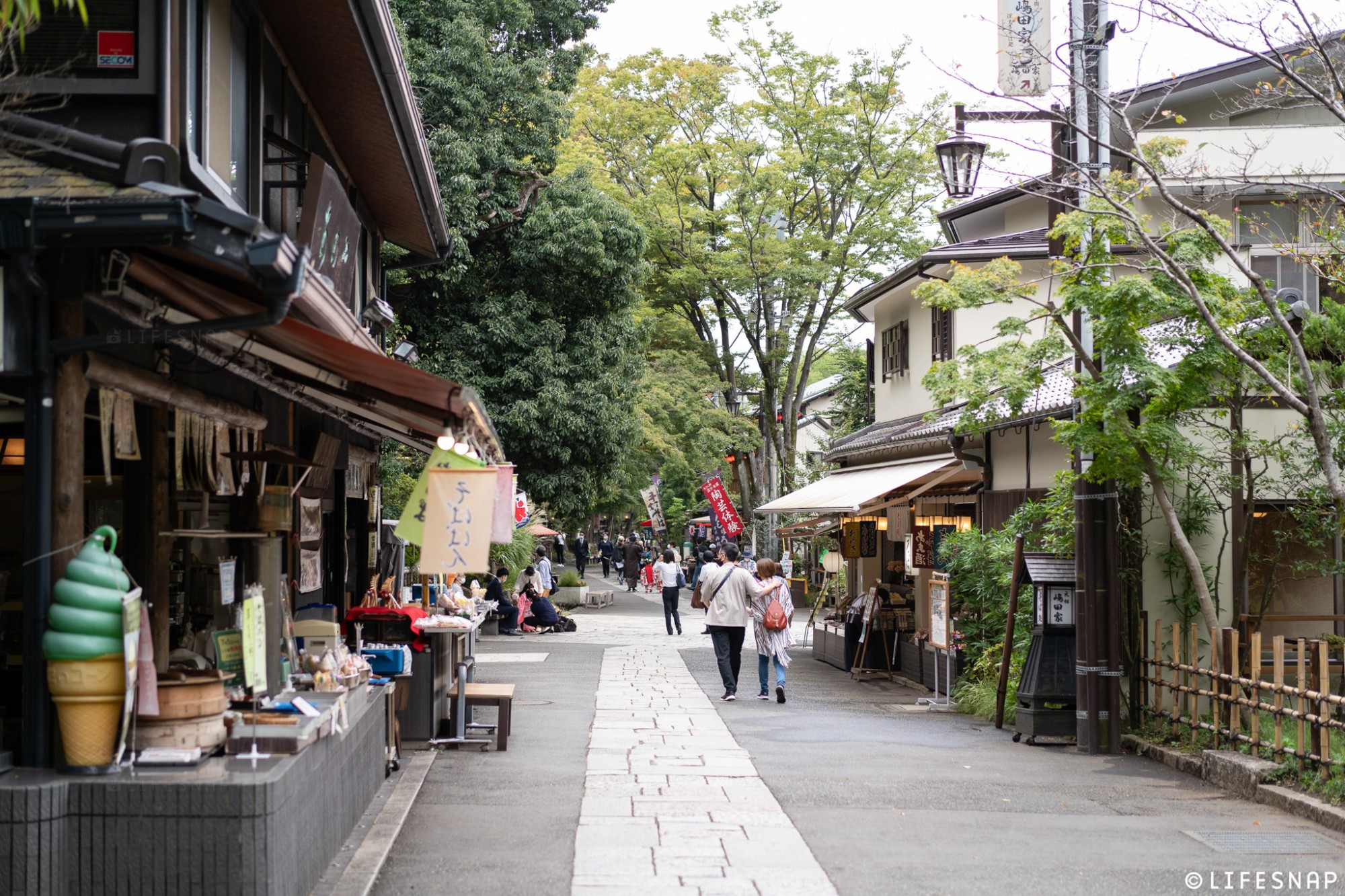 一年中観光客の絶えない人気の観光スポットで、お蕎麦屋さんなどの食べ物屋さん、土産物店など、古くからある老舗ばかりが軒を連ねるにぎやかな参道です。