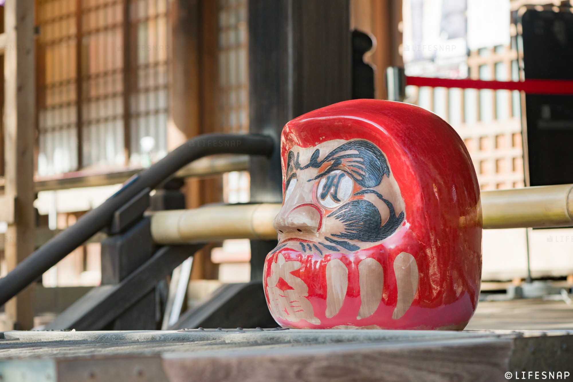 お賽銭の両脇には、病気平癒のご利益があるとされる「おびんずる様」と厄除けの「願掛けだるま」。