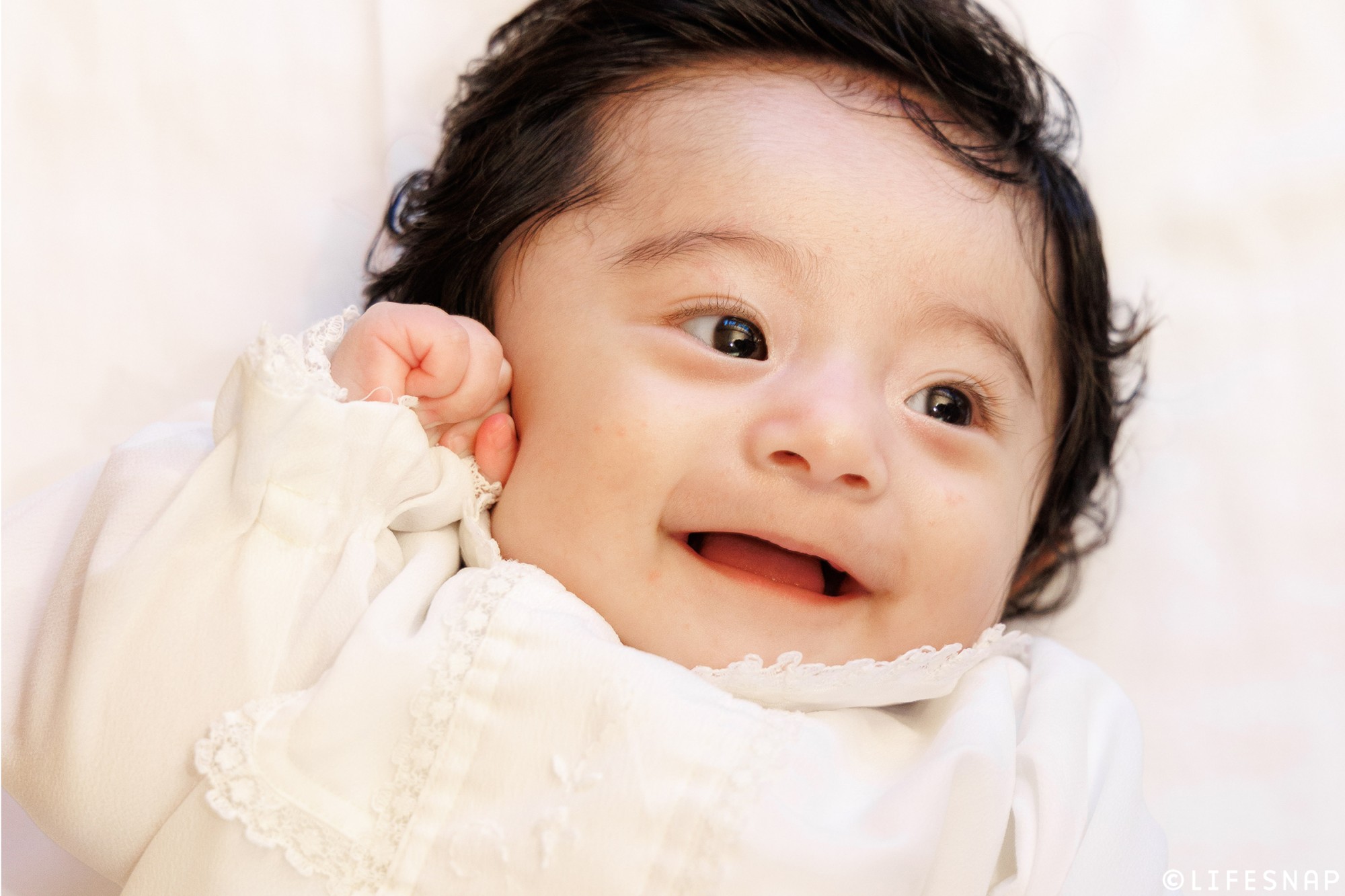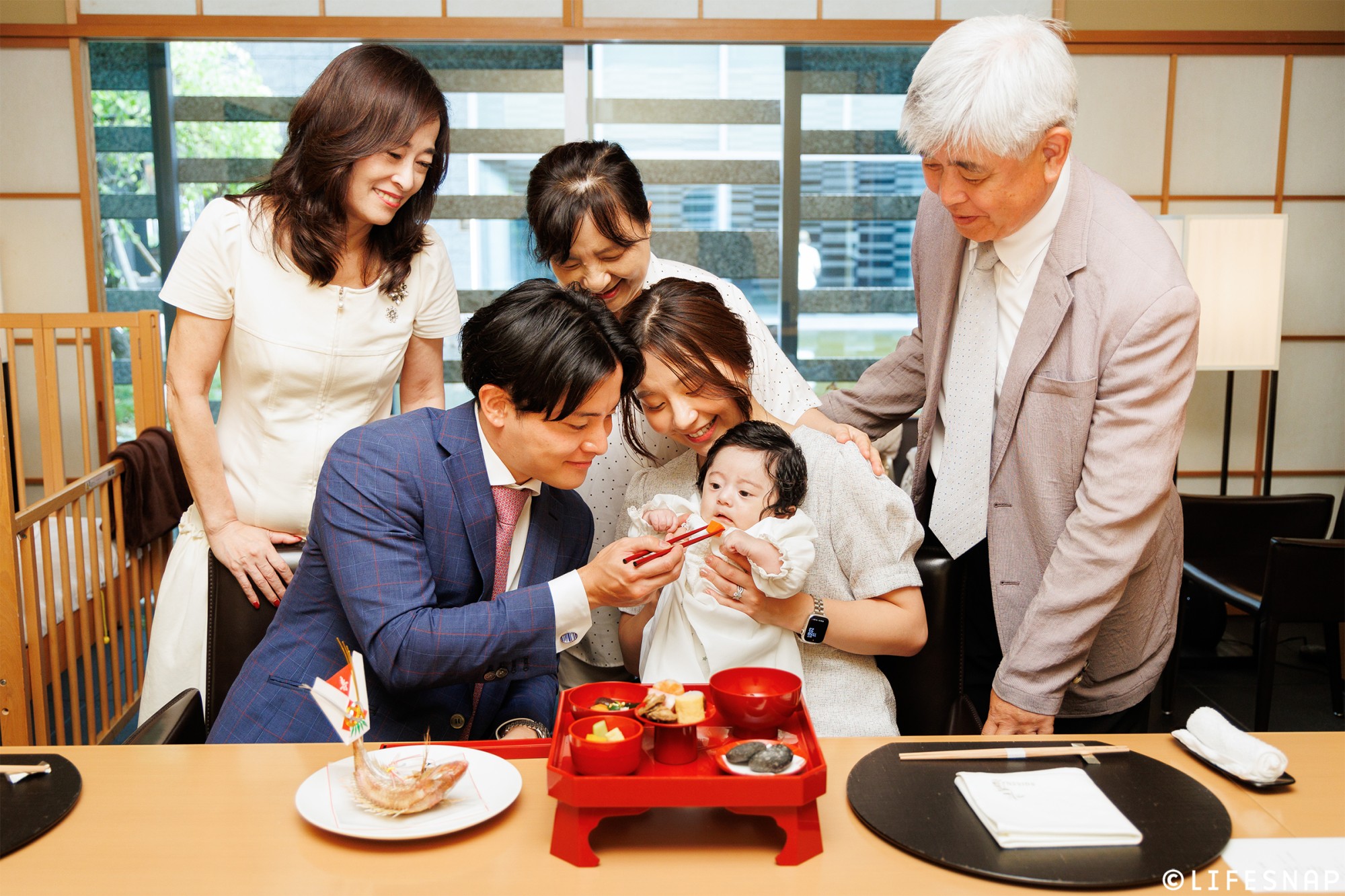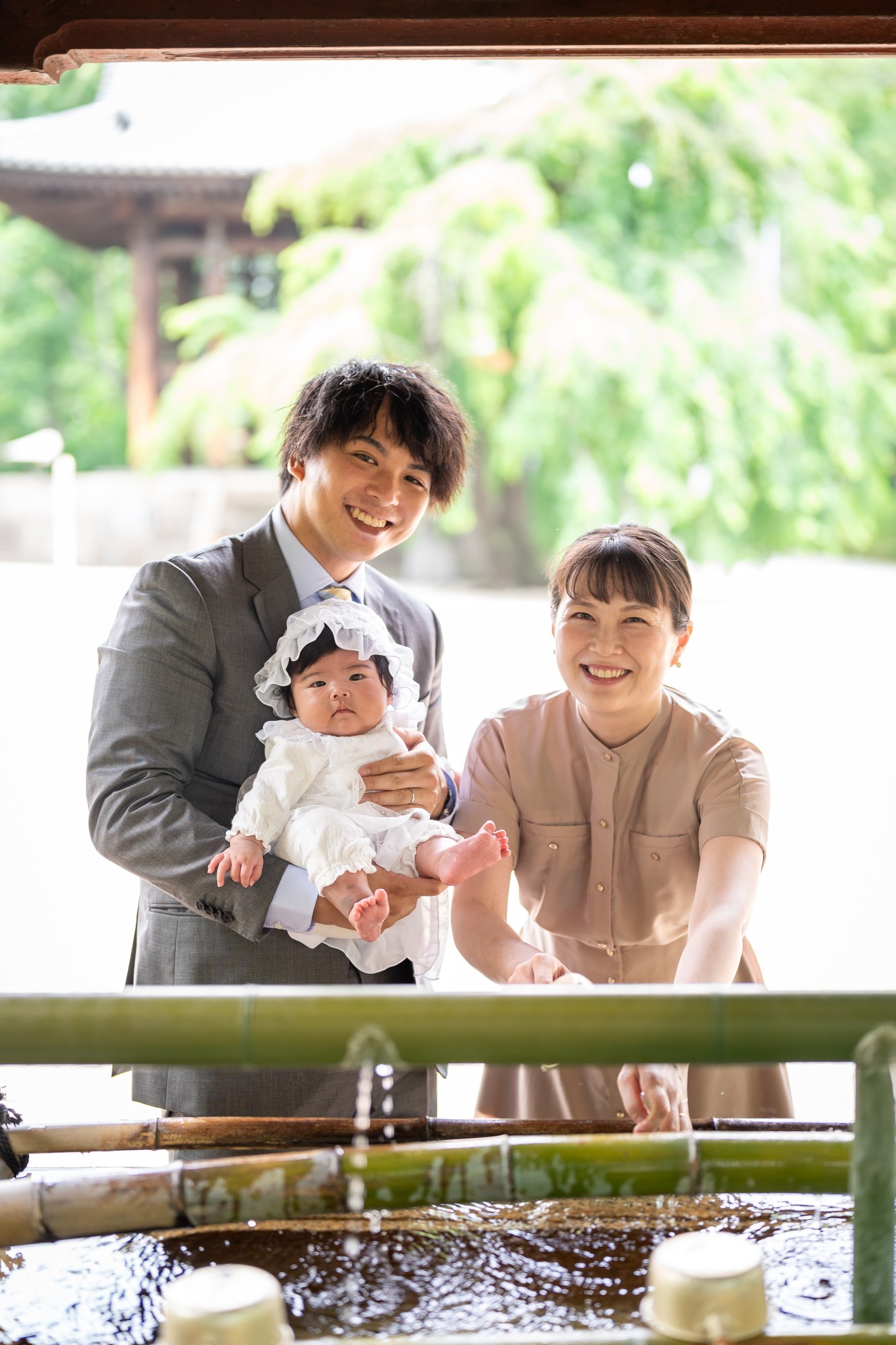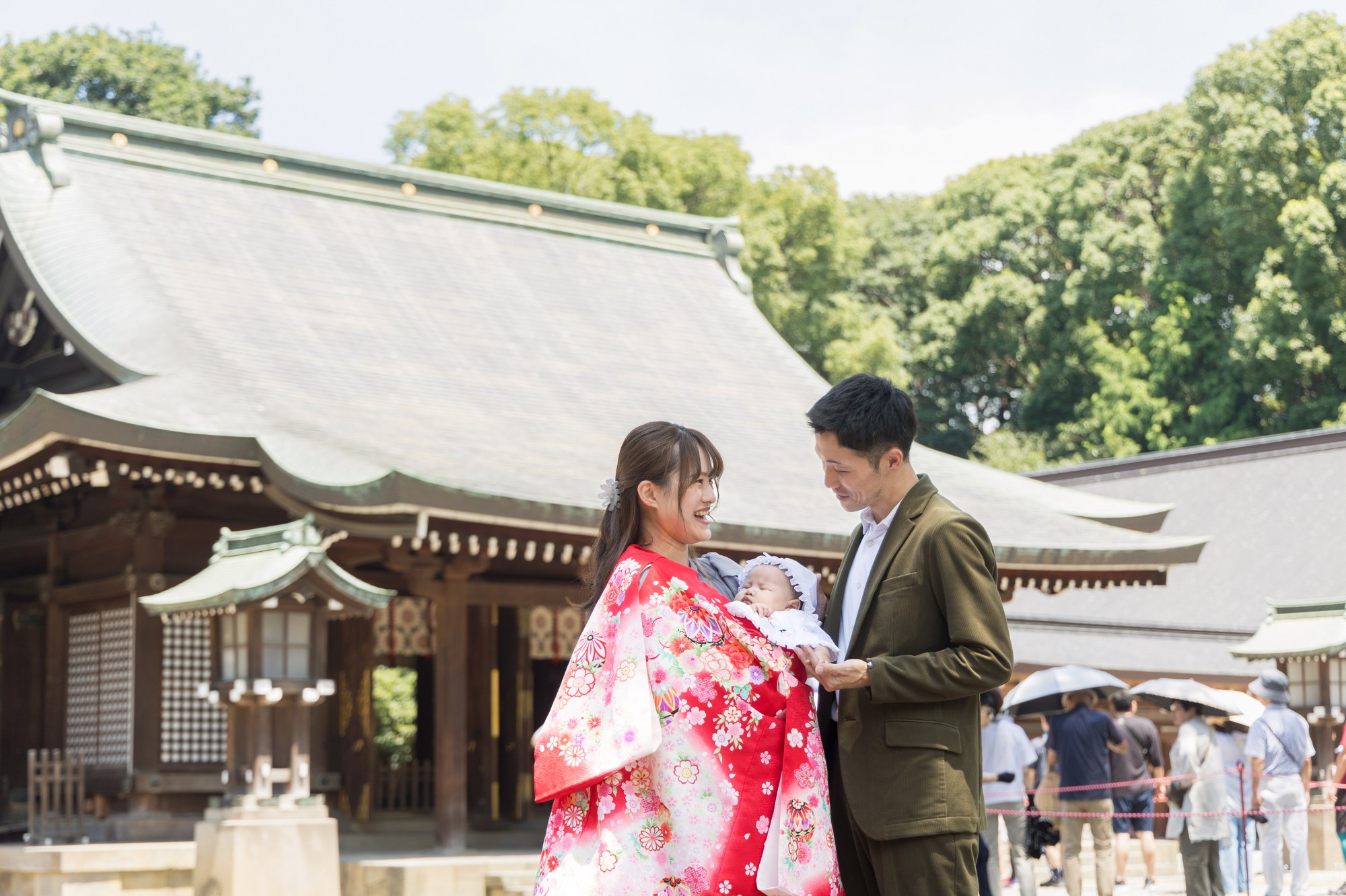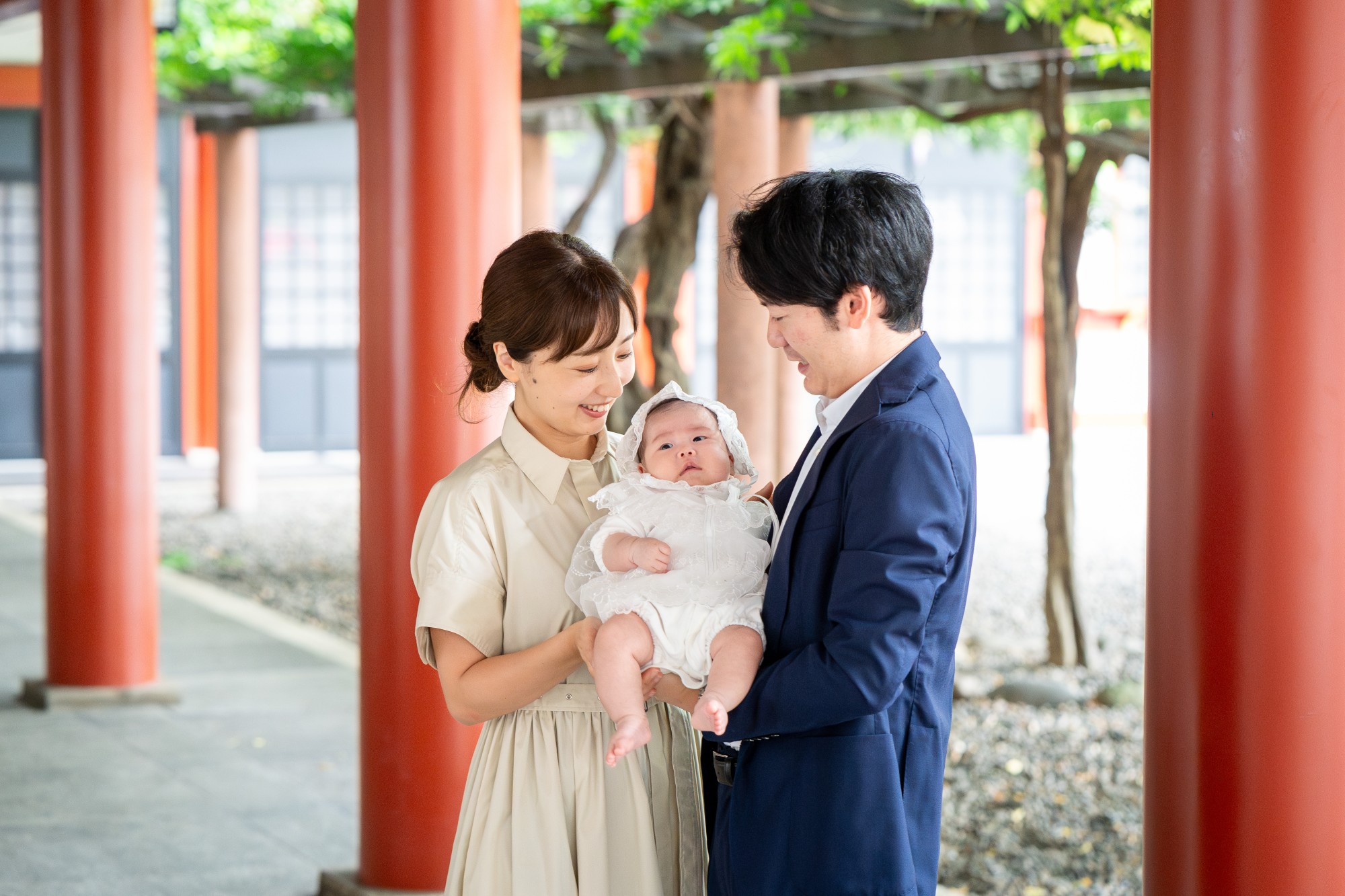 着物でのお写真も素敵ですが、和装でなくても大丈夫です。よくお見かけするのは、お父さまはスーツ、お母さまはワンピースやセレモニースーツ等です。生後間もない赤ちゃんは授乳間隔が短いため、前開きタイプの授乳しやすい服装が安心ということもあります。
