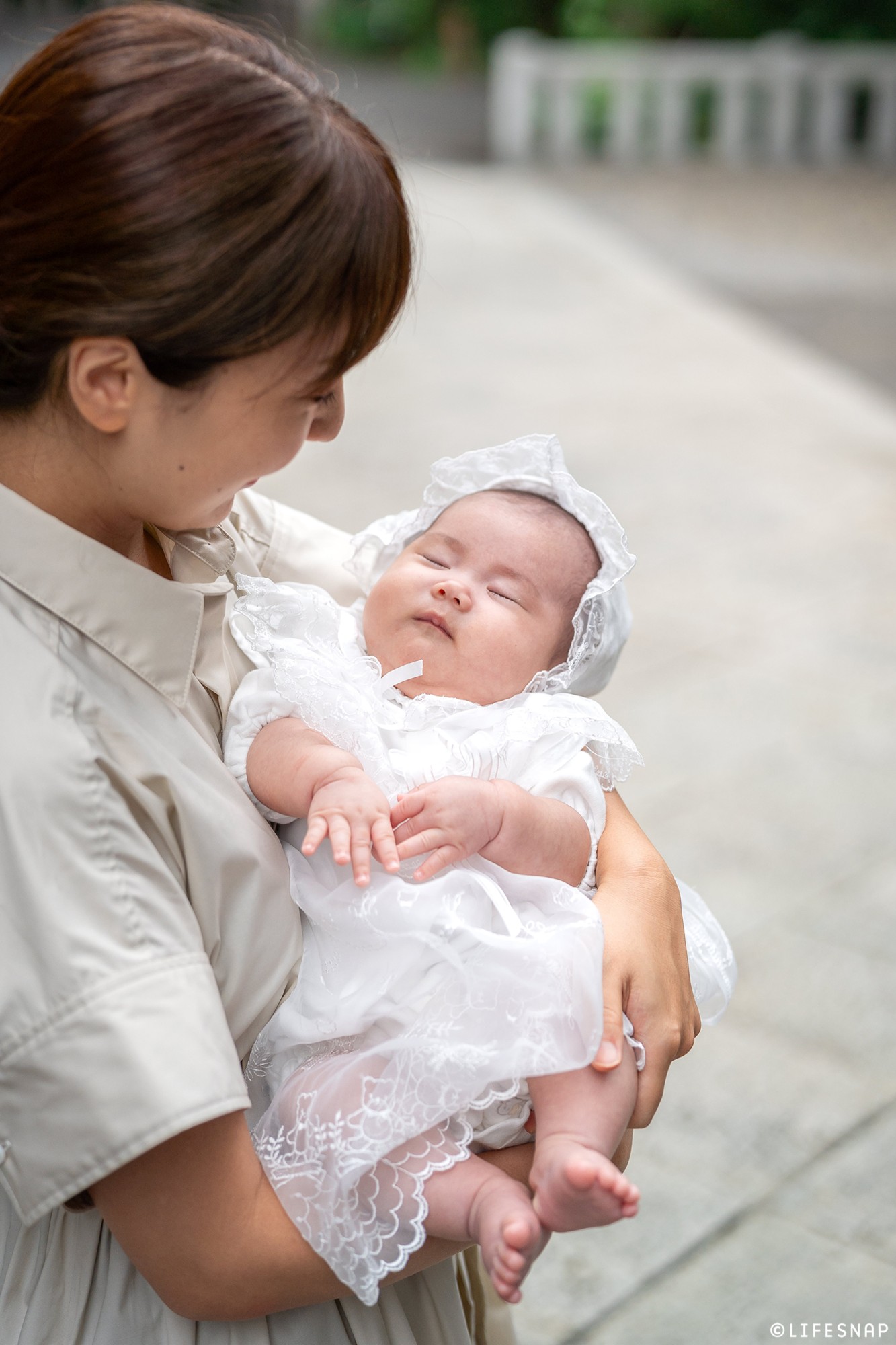 夏のお宮参りの場合は、記念撮影やご祈祷の時だけ着用するなど、熱がこもらない頻度で掛けてあげると良いかと思います。