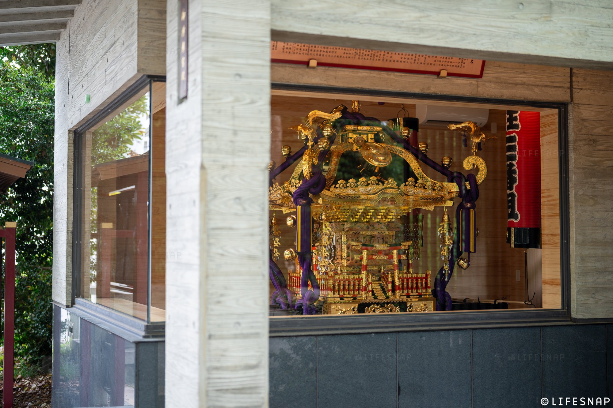 毎年8月に行われる王子神社の例大祭「槍祭(やりまつり)」の本祭の年に登場する荘厳な御神輿が収められた神輿蔵、ガラス張りとなっていてご覧いただけます。