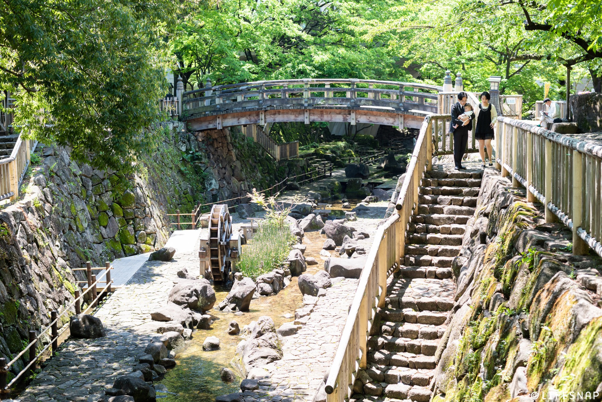 階段を下ると、橋の下は、整備され、水遊びもできる渓流のようになっています。