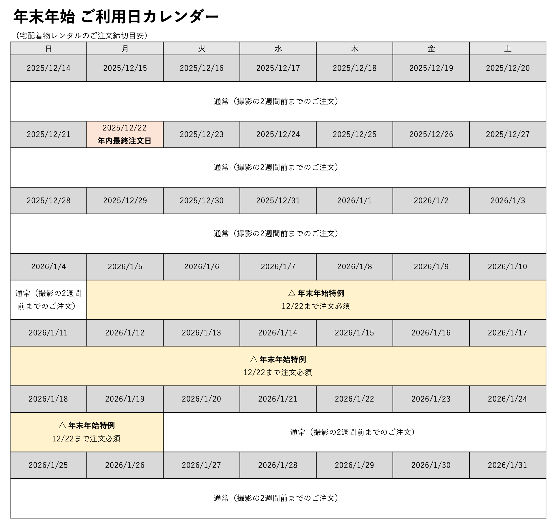 2025年12月22日(月)までに宅配着物レンタルのご注文をお願いいたします。